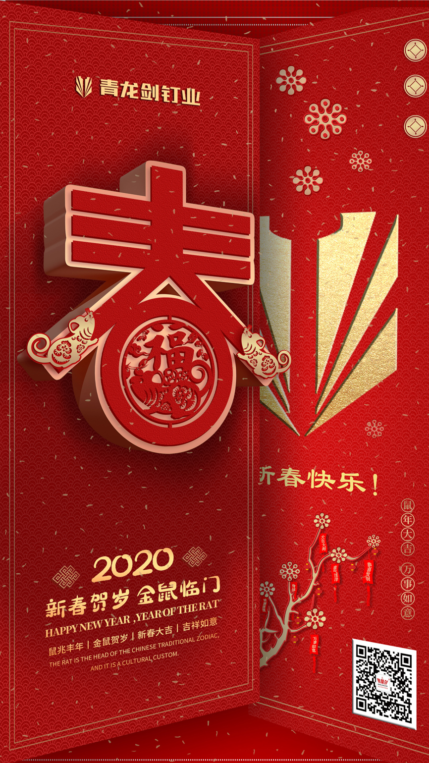 歲序常易,華章日新。當時光穿越年輪,邁向2020新春佳節,中華大地因納其盛世靈氣而芳澤毓秀,在這個充滿激情與期望的時刻,青龍劍釘業全體人員向所有關心關愛青龍劍公司發展的社會各界同仁、全國的經銷商和用戶朋友們致以親切的節日問候和誠摯的新春祝福!
