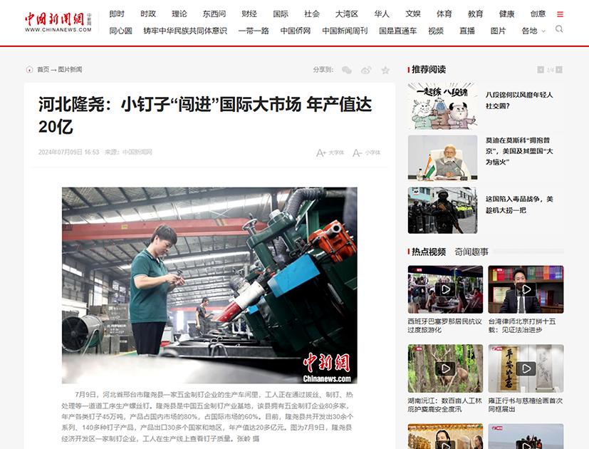 近日,中國新聞網記者走進河北隆堯青龍劍釘業有限公司,對制釘車間的生產工序及車間環境進行了解和拍攝。7月9日下午,青龍劍釘業榮登中國新聞網。