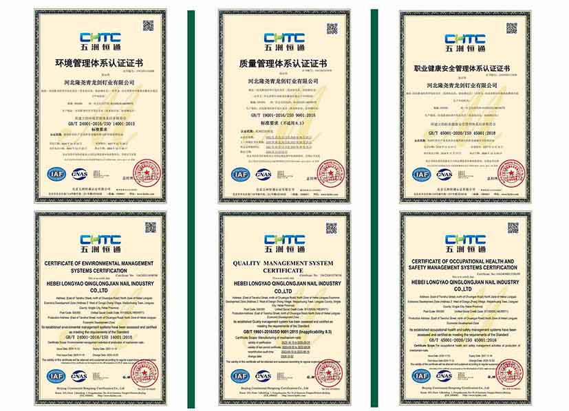 公司始終以“讓勞動創(chuàng)造更多價值”為企業(yè)理念,致力于生產(chǎn)優(yōu)質(zhì)高效的釘類產(chǎn)品。本次通過科學的管理體系和方法,不斷提升產(chǎn)品質(zhì)量與服務水平。此次公司通過了多項體系認證,標志著青龍劍公司一直保持符合國際標準化的管理體系要求,進一步鞏固了青龍劍在行業(yè)中的領先地位。