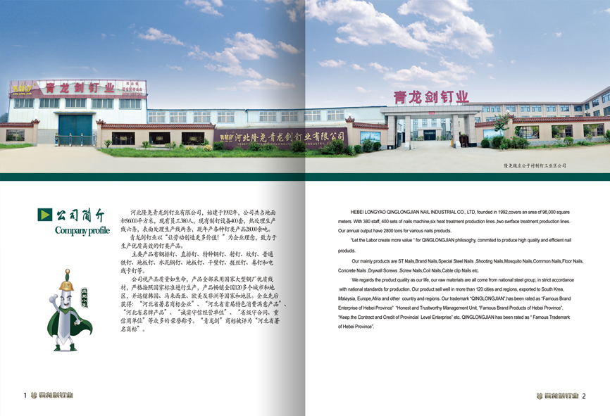 河北隆堯青龍劍釘業(yè)有限公司,始建于1992年,公司共占地面積96000平方米,現(xiàn)有員工380人,現(xiàn)有制釘設(shè)備400套,熱處理生產(chǎn)線六條,表面處理生產(chǎn)線兩條,現(xiàn)年產(chǎn)各種釘類產(chǎn)品28000余噸。