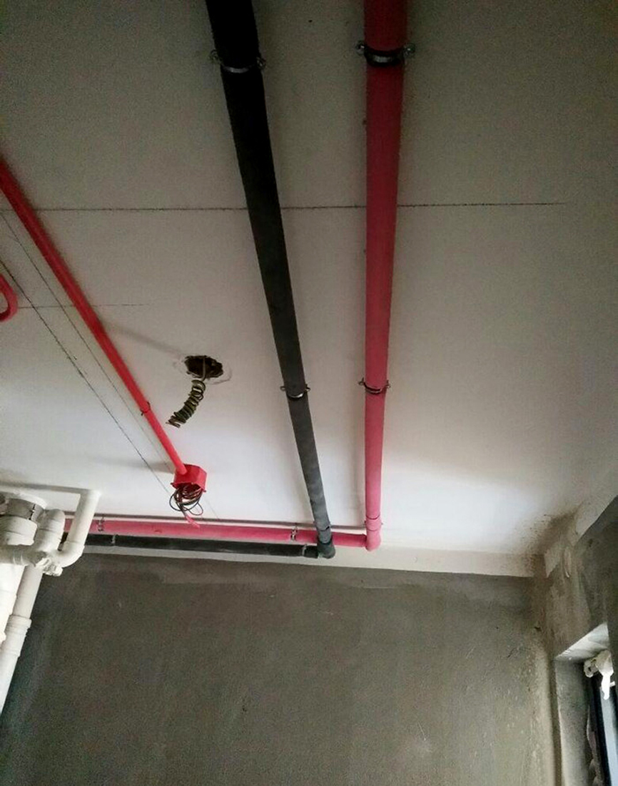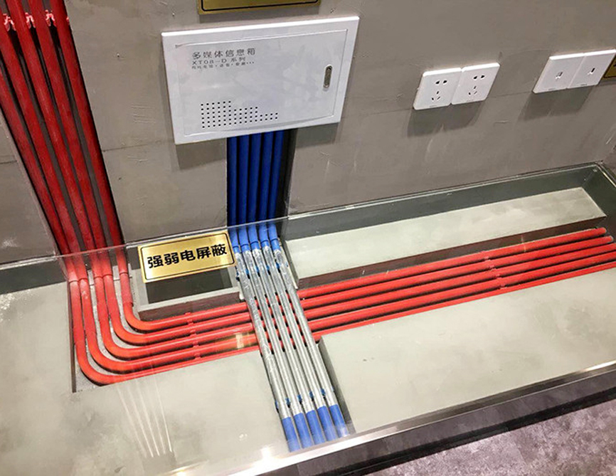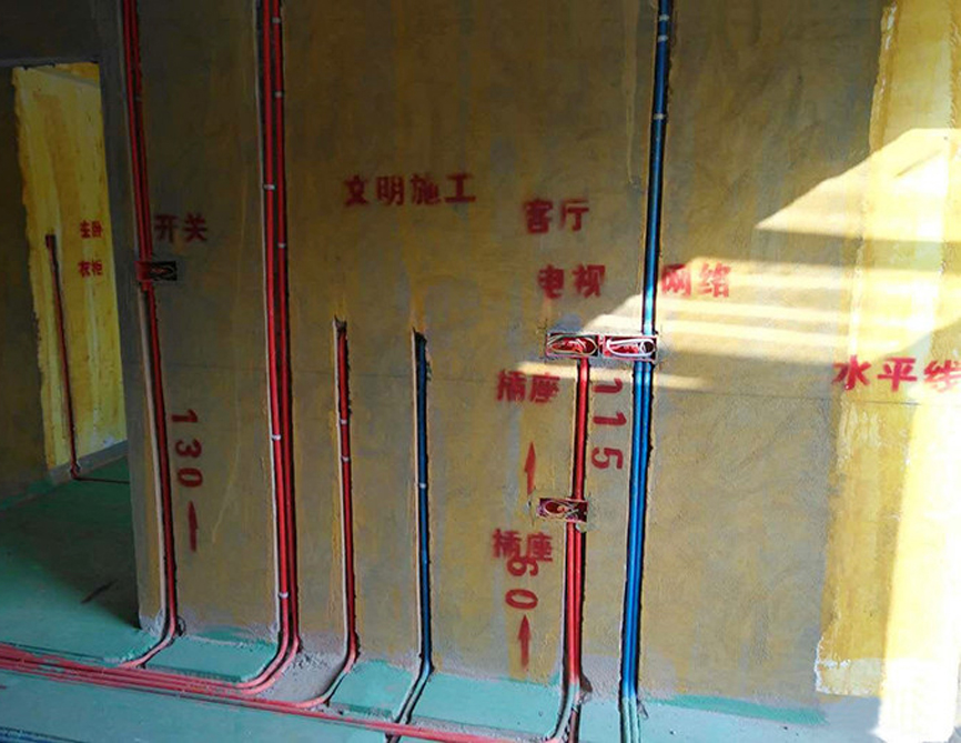 在標準裝修施工時,強弱線路必須采用PVC管進行套管保護,并通過不同顏色的PVC管進行區分,通常紅色PVC管為強電,藍色PVC管為弱電。